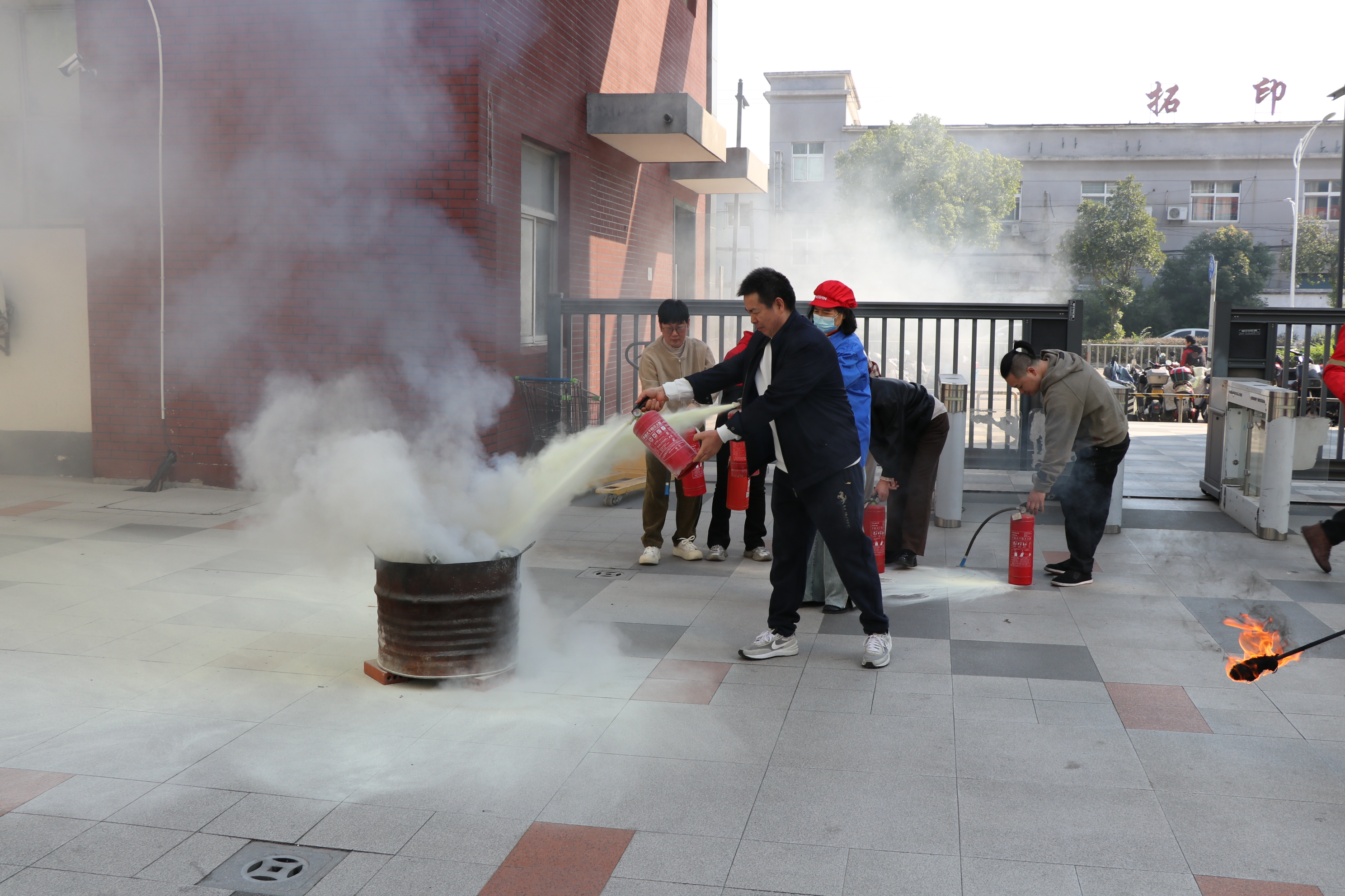 在成功完成疏散演练后,全体参演人员集中参加了安全知识培训与消防器材实操教学。大家认真听讲,并在企安安全公司的两位安全管理专家的指导下,逐一上手练习灭火器的正确使用方法。
